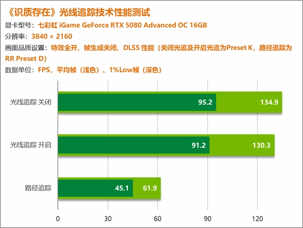路径追踪虽好,但对性能的影响非常巨大,以RTX 5080在4K分辨率下的成绩为例,平均帧数从开启常规光追时的130.3 FPS暴跌至61.9 FPS,跌幅超过50%,要知道这还是DLSS性能模式下的表现。