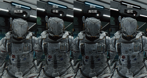 《识质存在》拥有4个预设画面档位,画质由高到低分别为“高质量”、“平衡”、“高性能”、“最低”。需要注意的是,《识质存在》的预设画面档位并非与普通游戏一样仅修改部分画质选项,而是将分辨率与超分辨率技术捆绑在一起。在“高质量”档位游戏会开启传统光线追踪,但不会使用超分技术,降低至预设“高性能”档位后,游戏会开启FSR 1超分技术,并将FSR档位降低至“高性能”。在预设“最低”档位,游戏直接将分辨率降低至720P,但FSR档位会上调至“平衡”。