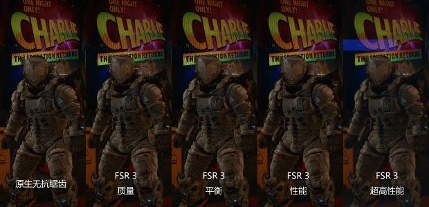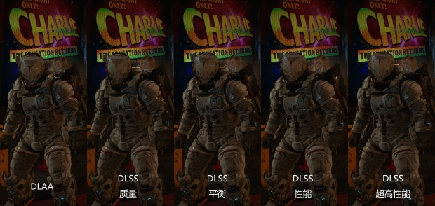 就画面表现而言,DLSS在“质量”模式下表现极其接近DLAA原生渲染,对于背景海报中“CHARLIE”字样的边缘勾勒非常锐利,且盔甲缝隙的细节阴影保留完整,即便在“超高性能”模式下,画面边缘的抖动和锯齿感也控制得相对自然。