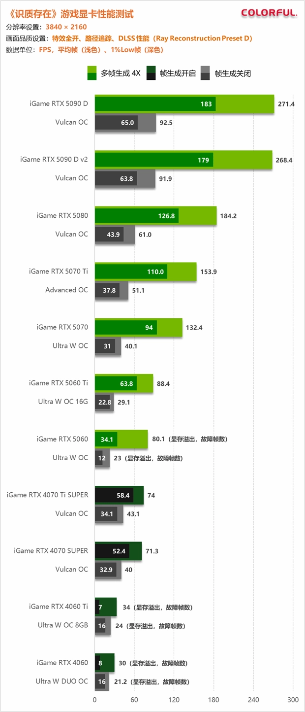 在4K分辨率、特效全开并开启路径追踪的极端负载下,即便强如RTX 5090 D,在关闭帧生成时也仅能维持在百帧以下,而通过多帧生成4X技术的加持,帧数能实现质的飞跃,突破270 FPS大关。RTX 5080与RTX 5070 Ti在开启帧生成后依然能保持过百帧的高流畅度。不过对于显存容量较小的型号(如RTX 5060及上代部分显卡),4K路径追踪会导致严重的显存溢出,即便AI补帧能强行拉高数值,但由于爆显存引发的画面错误和掉帧风险,其测试数据已失去实际参考价值,这也说明了顶级光影效果对显存容量有着极高的硬性要求。