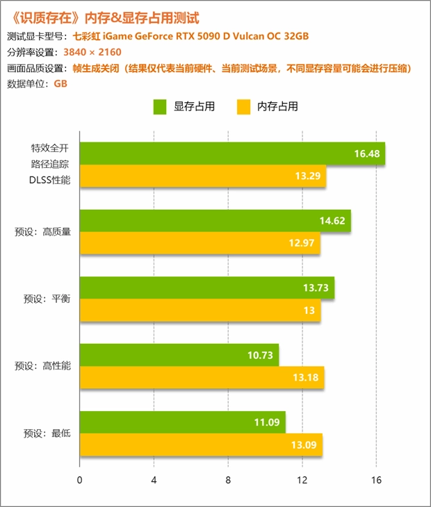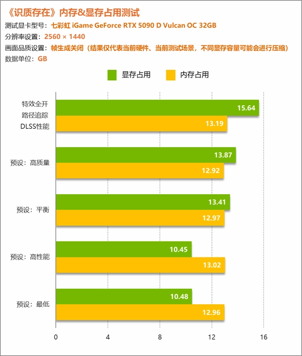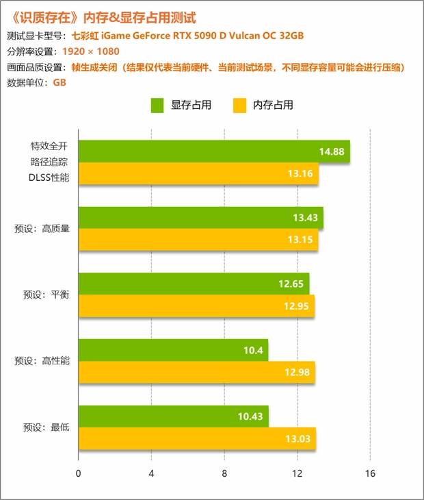 内存占用方面,通过不同画质不同分辨率的组合测试,可以发现占用基本在13GB左右波动。不过显存方面就明显不同了,在使用RTX 5090 D进行测试时,其无压缩显卡显存占用一度超过了16GB,即便是在1080P最低画质下也未低于10GB。当然,由于我们测试使用的是RTX 5090 D,当使用更小显存显卡时实际占用情况会发生变化,测试结果仅供参考。