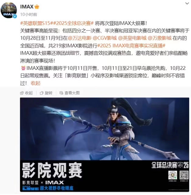 2025《英雄联盟》S15全球总决赛将再次登陆IMAX大银幕,包括四分之一决赛、半决赛和冠亚军决赛在内的关键赛事将于10月28日至11月9日在全国近百城、共219家IMAX影院进行实况直播。