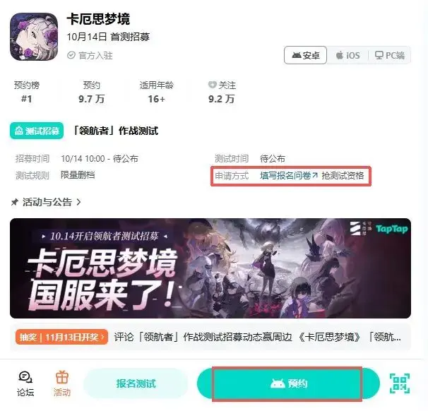 预约《卡厄思梦境》 +评论本贴,抽取五位领航者送出本次测试资格,11月18日开奖。