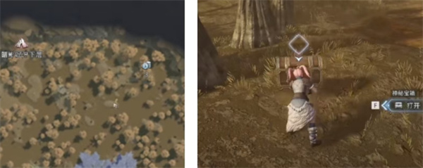 建筑倒塌围墙上有紫色灌木丛,跟随灌木丛攀爬至建筑顶端即可触发宝箱