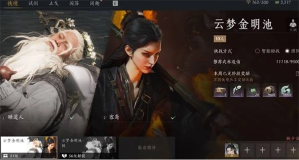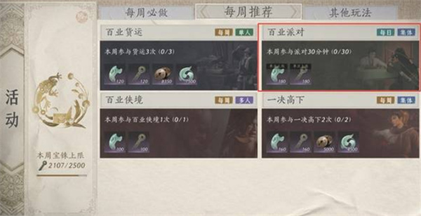 1、侠境(51级解锁):120心力/次,每周一次奖励可额外获得一次