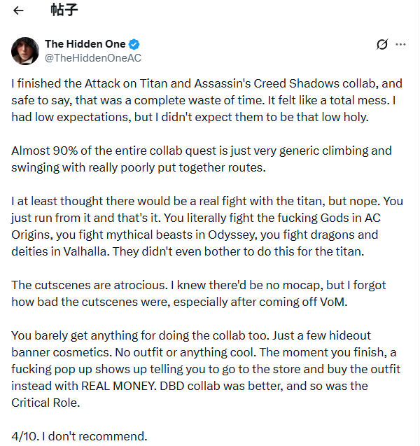 另一名玩家TheHiddenOneAC对《刺客信条:影》的《进击的巨人》联动评价不佳,称其是“一场完全浪费时间的体验”,并指出约九成内容仅是“普通的攀爬与摆荡路线”,且设计粗糙。他还对无法与巨人战斗表示失望,认为此前系列已与诸神、神话生物等战斗过,但这次却未实现类似内容。