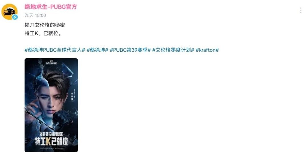 昨天,《绝地求生》官方正式宣布蔡徐坤担任该游戏的全球代言人,同时公布了官方海报。此外,《绝地求生》第39赛季第一轮更新目前已经上线。