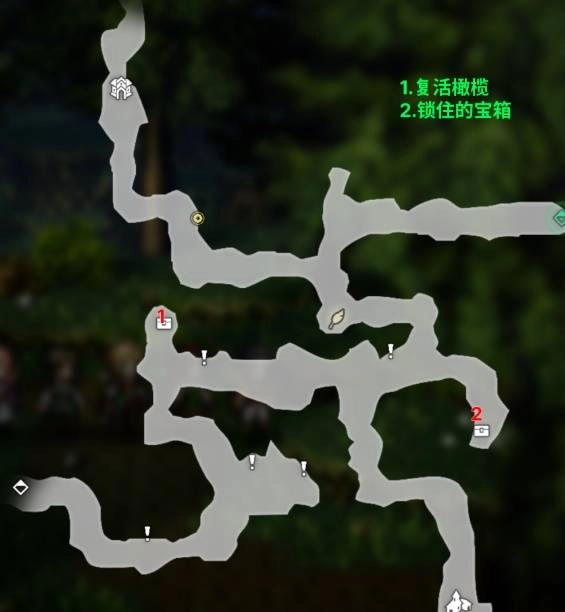 宝箱1的位置信息如下:所在区域为瓦洛雷林道,内含物品是复活橄榄,宝箱类别属于普通宝箱,具体位置说明为:此宝箱处于地图上标注的1号标记点处。