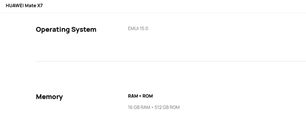 与国内版本不同的是,海外版Mate X7在华为商城未标注处理器型号,系统采用EMUI 15.0。