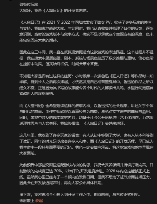 《人窟日记》的开发者未燃在社媒发文,分享了游戏开发的心路历程,承诺将这款游戏完整地呈现在大家面前。原文如下:
