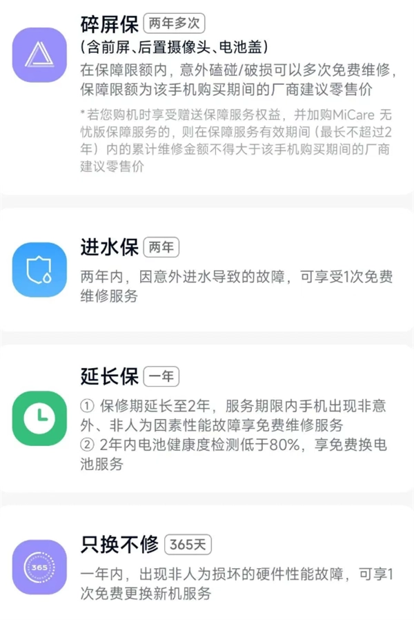 权益包括两年多次碎屏保、两年进水保、一年延长保、365天只换不修。