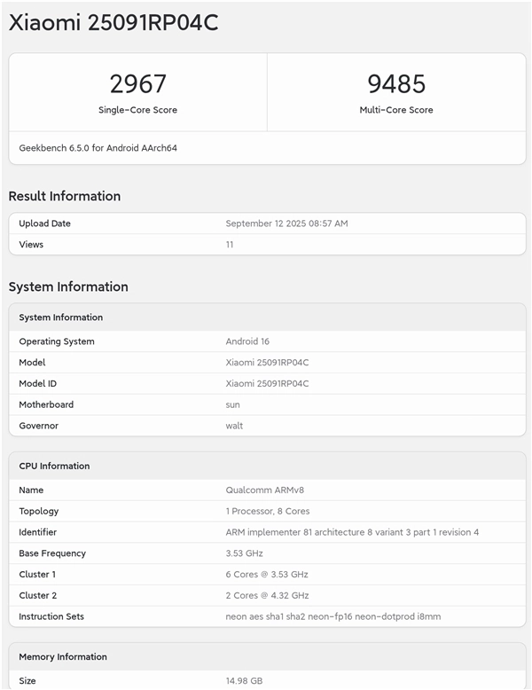 此前的跑分已经确认,小米平板8Pro会搭载骁龙8Elite处理器,而且是4.32GHz的满血版,配备16GB内存。