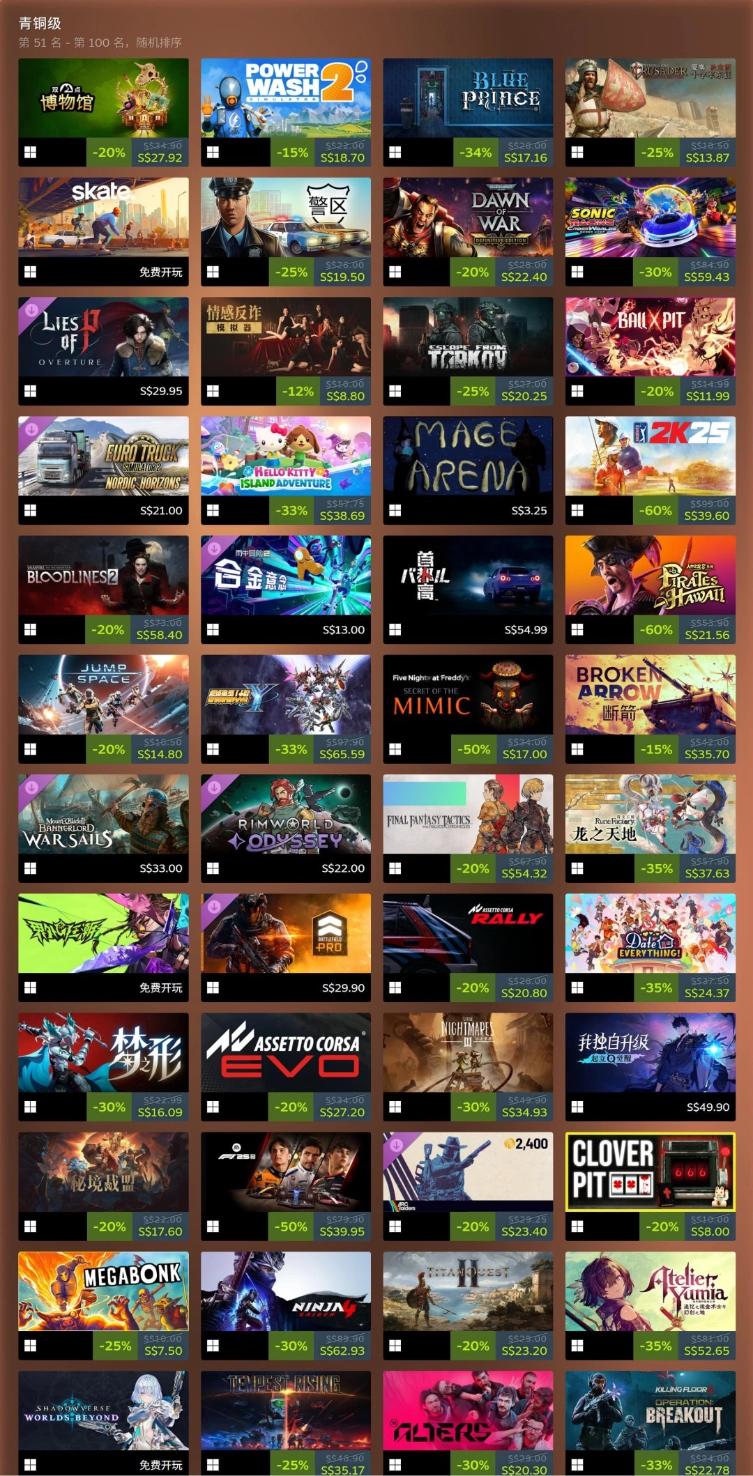 截至本文撰写时,距离2025年结束已不足40个小时,Steam Charts公布了该平台2025年度收入排名前100的游戏名单。其中,《战地6》《Arc Raiders》《Schedule I》《空洞骑士:丝之歌》等作品跻身铂金级行列,《剑星》(PC版)、《刺客信条:影》《光与影:33号远征队》《欧陆风云5》等则位列黄金级。
