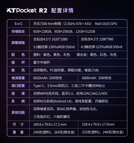 这款掌机的双比例屏幕规格如下:3:2屏幕版本的尺寸是169.6×79.8×17.2mm,4:3屏幕版本则为159.4×79.9×17.9mm。两款机型均配备了采用4nm制程工艺的天玑7300芯片。