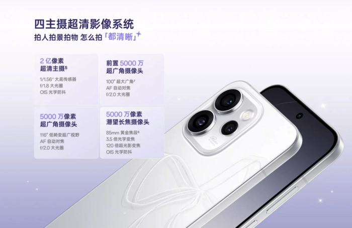 影像方面,OPPO Reno15星星粉主打“跨年好搭子”,搭载四主摄超清影像系统,覆盖多场景拍摄需求:包括2亿像素超清主摄、5000万像素潜望式长焦、5000万像素超广角以及前置5000万超广角摄像头。其中潜望式长焦镜头支持3.5倍光学变焦,在同价位中较为少见,适合拍摄烟花特写或远处景物;超广角镜头则可轻松应对全家福等多人合影场景。