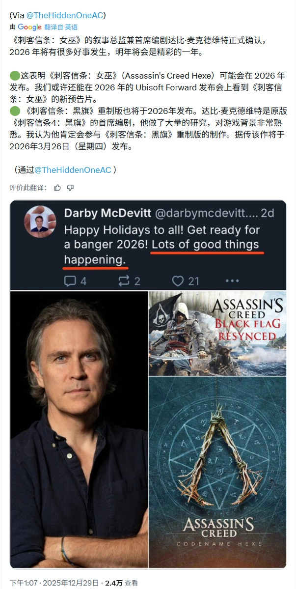 Darby McDevitt最近确认“2026年将有很多好事发生,明年将会是精彩的一年”,暗示《刺客信条:女巫》以及《刺客信条4:黑旗-重制版》都会在2026年发售