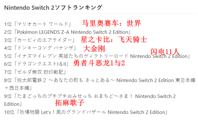 ·2025年度Switch 2游戏在任天堂e商店的销量TOP10: