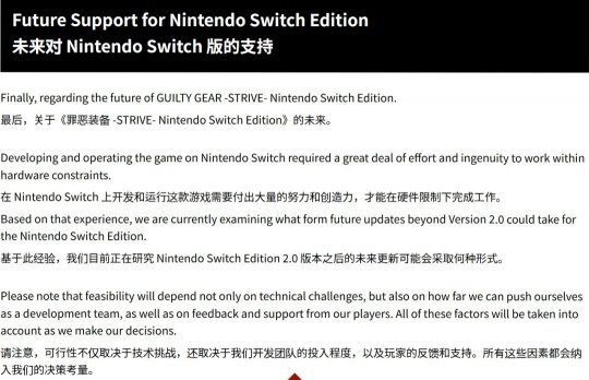 公告中,开发团队没有明确表示会马上停止支持,不过他们坦言,随着游戏后续更新内容不断增多且愈发复杂,Switch版本的持续运营将会面临越来越大的挑战。官方称:“关于《罪恶装备:STRIVE》Nintendo Switch版的后续发展,我们正探讨2.0版本推出后可能采用的更新方式。在Switch平台进行游戏的开发与运营,要求我们在硬件条件的限制下投入大量精力,同时充分发挥创意。基于这段时间的经验,我们正在对后续更新的可行性展开审慎评估。”