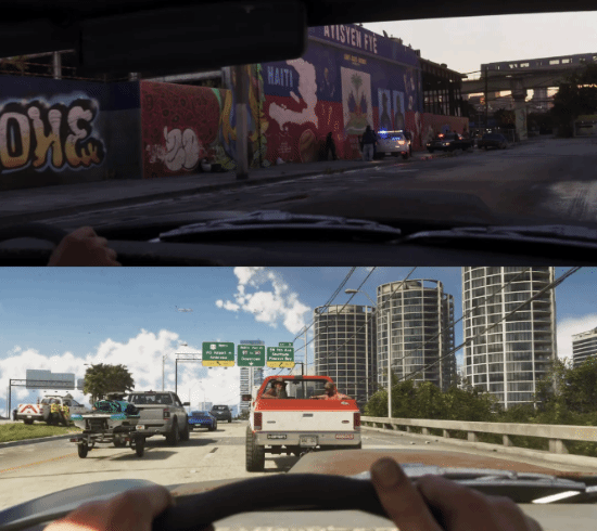 这两个画面本身其实只是车辆在城市中行驶时的第一人称视角,但结合《GTA6》目前展现出的极高拟真画面表现,第一人称或许会成为最具沉浸感的游玩方式。