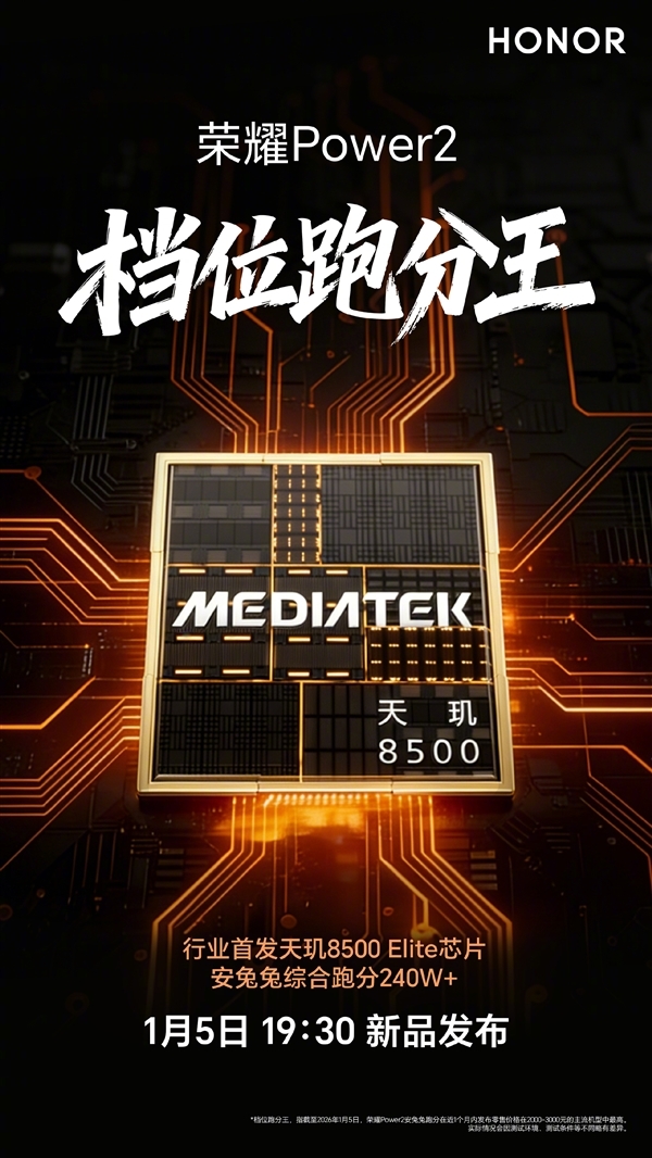 1月5日消息,今晚19:30荣耀将举办新品发布会,正式发布续航表现出色的新机——荣耀Power2。