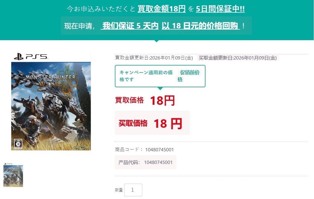 尽管卡普空不断推出更新来优化《怪物猎人:荒野》的游戏体验,然而该作由于内容量比不上前作、性能问题频繁出现(特别是PC版本),市场表现一直不太理想。最近,日本二手回收店铺“Kaitori World”对该作PS5版的回收价格已经低到18日元(大概相当于人民币0.80元),这反映出游戏在日本本土市场面临的严峻状况。
