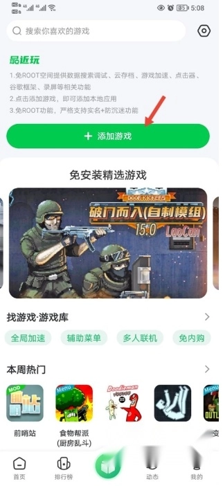 首先进入游戏盒子后,点击中间的root空间,再点击添加游戏。