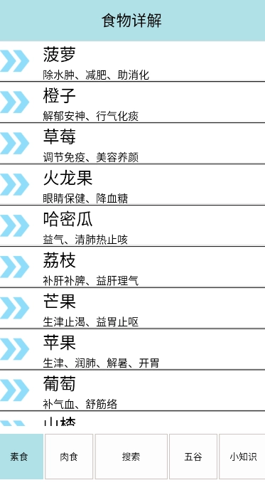 这里以食物详解为例,点击进入后,能看到水果、肉食、五谷等不同栏目。