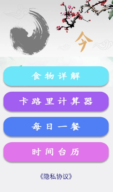 打开这款软件后,在主界面就能看到它包含四大功能:每日一餐、卡路里计算器、时间台历和食物详解。