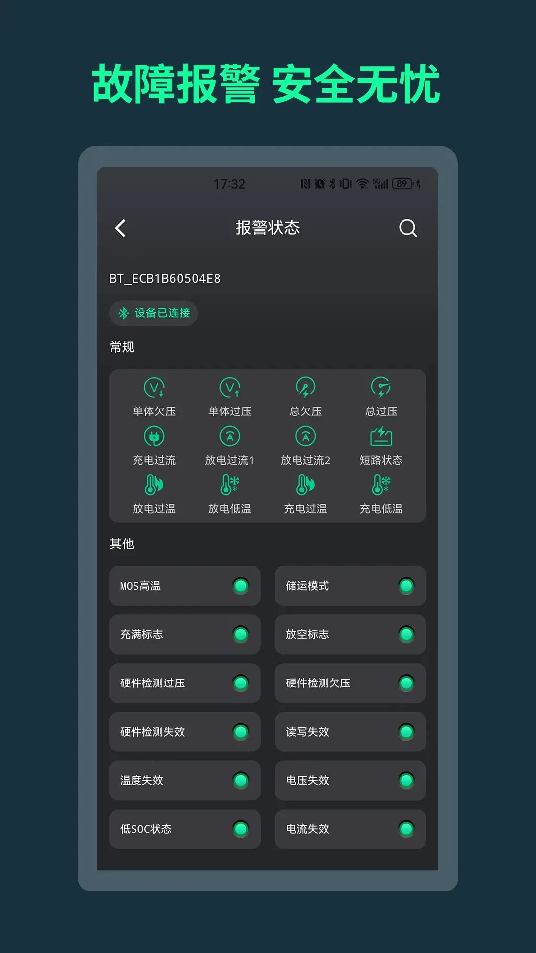 故障报警功能可提供电池故障的报警信息,让用户能够随时查看电池的报警状态。