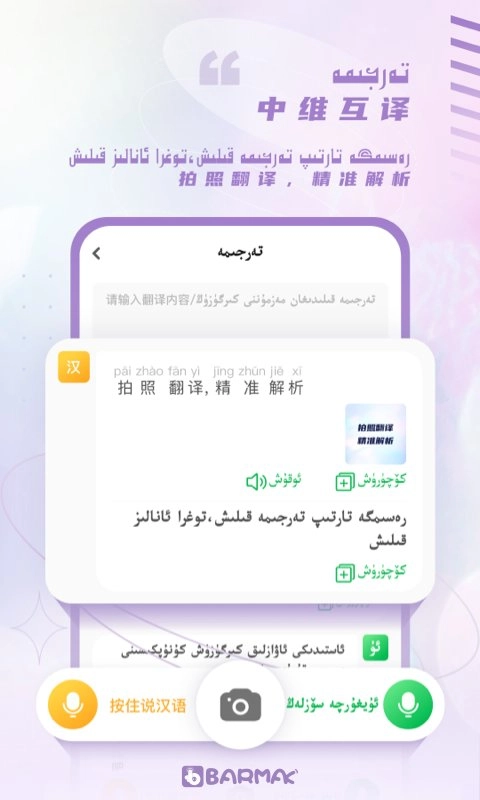 barmak输入法是一款维语手机输入法,它支持维语、汉语和英语三种语言,还具备维汉互译功能,以及智能语音输入等实用特性,能帮助用户更便捷地进行手机打字输入,有需要的小伙伴可以来体验一下哦~~~