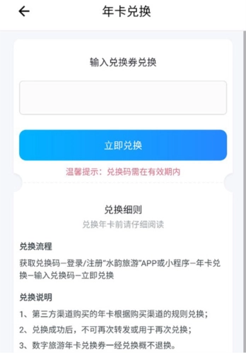 除了购买年卡之外,也能够进行年卡兑换操作。只需点击“年卡兑换”,接着输入兑换券的券码,再点击下方的“立即兑换”就完成了。
