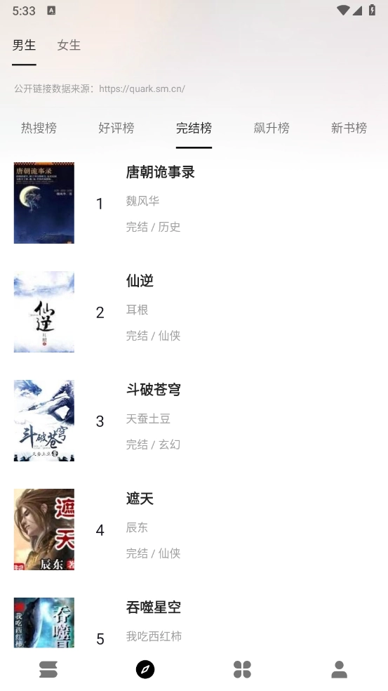 打开后,男生女生都能找到适合自己的小说,还可以选择性别来获取精准推荐,同时也有热搜榜、完结榜和飙升榜的内容推荐。