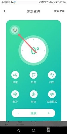 选择完成后,软件会直接跳转至该设备的遥控界面,用户只需点击界面左上角的电源按钮即可(位置见下图红色箭头指示)。