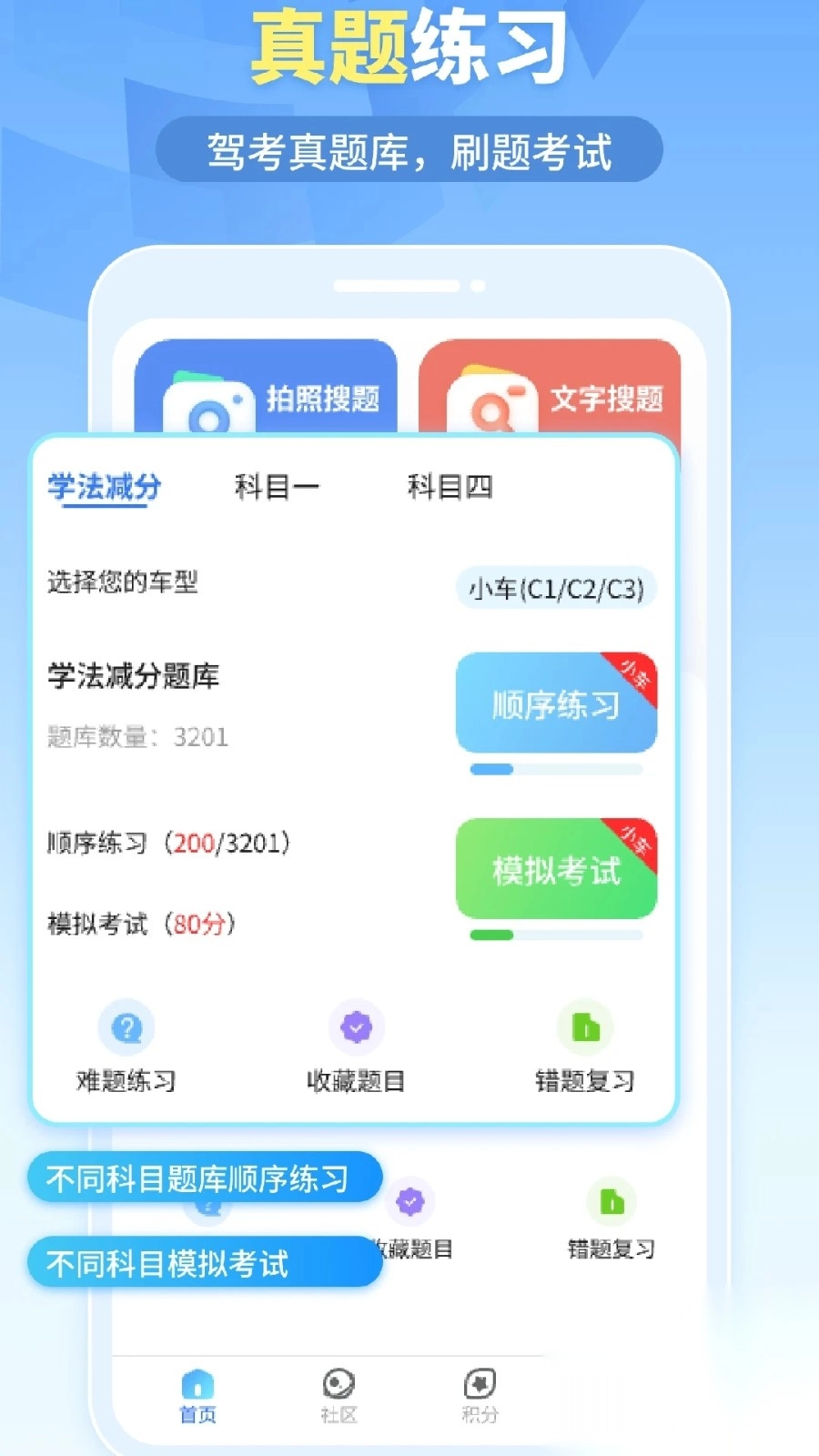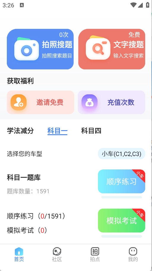 首页设有拍照搜题与搜题功能,同时包含学法减分、科目一及科目四的学习板块。