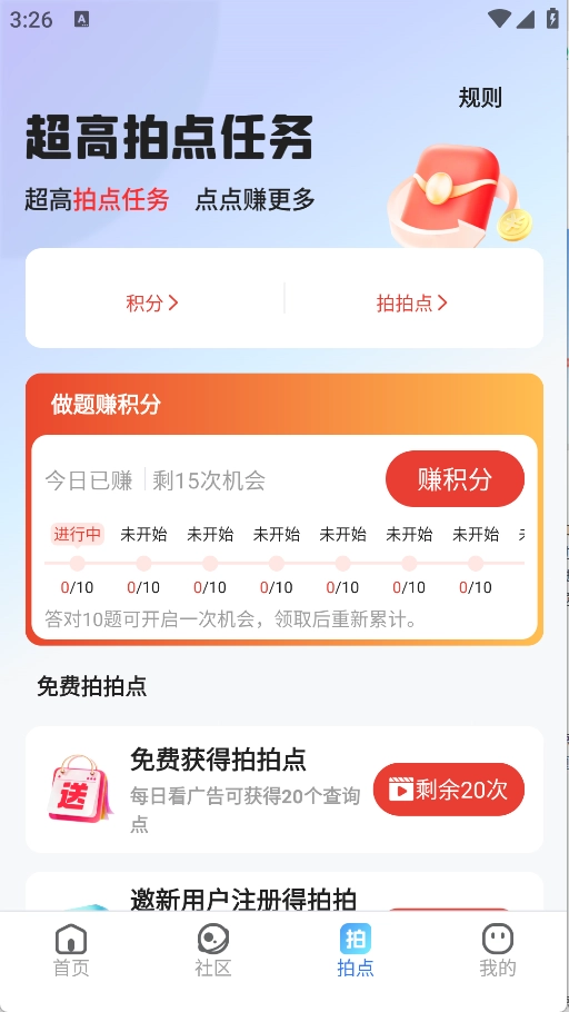 在拍点里,不仅能通过做题赚取积分,还能免费获取拍拍点。