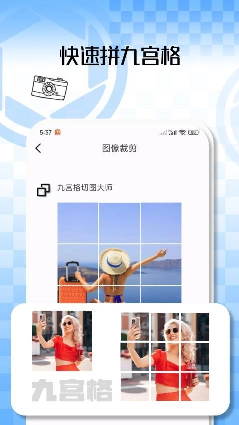 支持把照片智能裁剪成标准九宫格或者自定义网格布局,操作简便,一键即可完成。