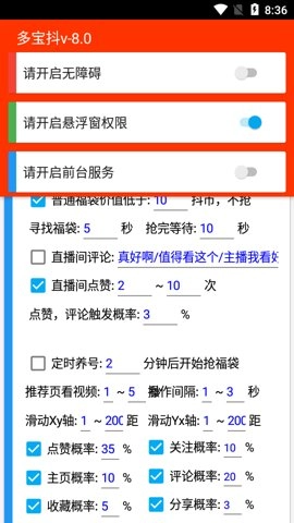 打开多宝抖应用,进入软件的主界面;2. 进入上方的权限设置页面,将所有权限开启。