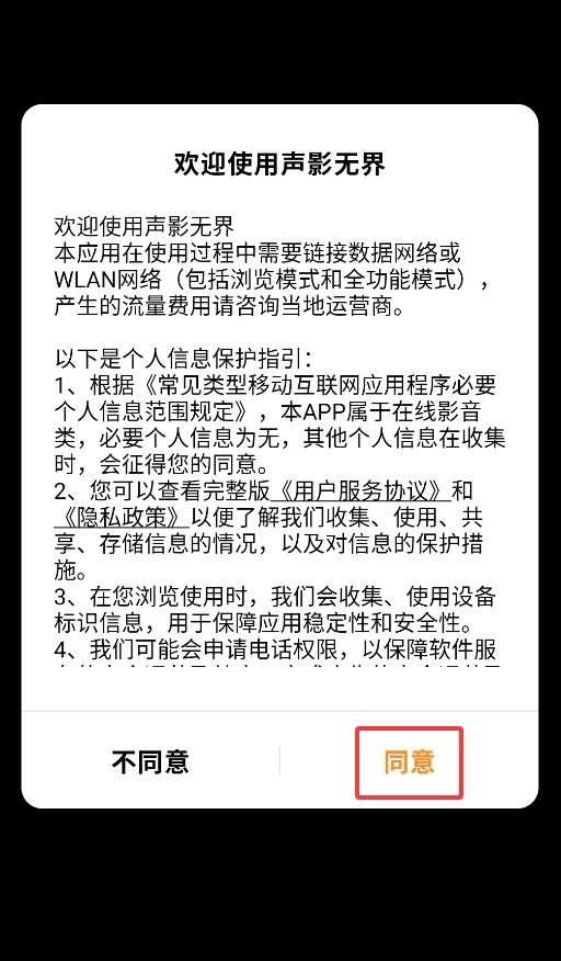 首次启动应用时,需点击同意用户协议弹窗,才能进入主界面开始使用。