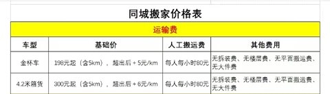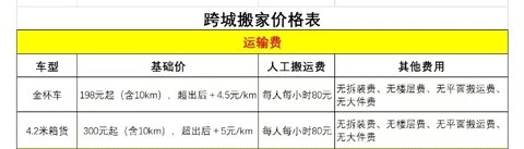 金杯车的基础价格从198元开始(包含10公里路程),行驶距离超过10公里后,每公里额外加收4.5元;人工搬运服务的费用是每人每小时80元,除此之外没有其他收费项目。 4.2米厢货车的基础价格为300元起(包含10公里路程),行驶距离超出10公里后,每公里加收5元;人工搬运费同样是每人每小时80元,没有其他额外费用。
