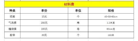 纸箱每个单价15元,规格是40×50×60;气泡膜每卷单价200元,规格为1.2米宽;缠绕膜每卷单价100元,规格是60厘米宽;胶带每个单价20元,规格为100米。