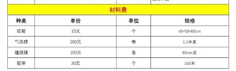 纸箱每个15元,规格为40×50×60;气泡膜每卷200元,宽度是1.2米;缠绕膜每卷100元,宽度为60厘米;胶带每个20元,长度是100米。