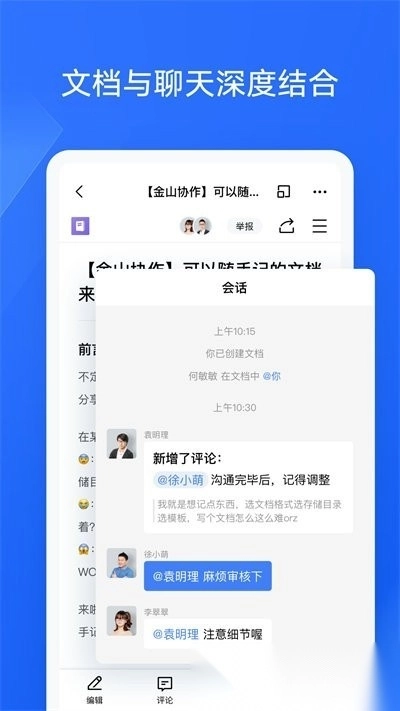 【文档会话】功能支持在文档内发起讨论交流,同时能够查看历史聊天记录,有效保障沟通内容可追溯留痕;