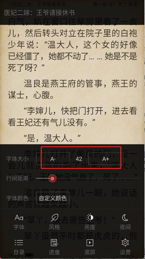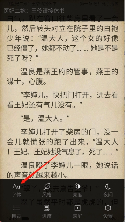 进入小说阅读页面后,点击屏幕任意一处,再点击“字体”按钮。