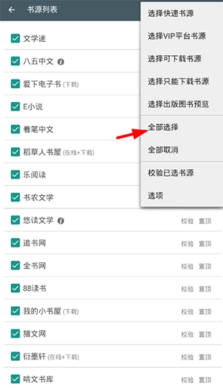 3、在弹出的列表里,选中“全部选择”功能,如此便能把现有的书源全部添加。