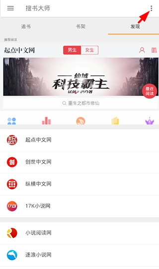 1、在软件中添加更多的书源,选择首页右上方的三点选项,打开“书源管理”功能