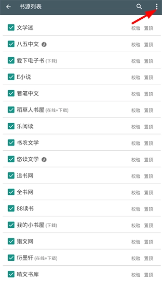 2、在书源管理页面里,继续选择右上角的三点按钮,进行书源的添加管理