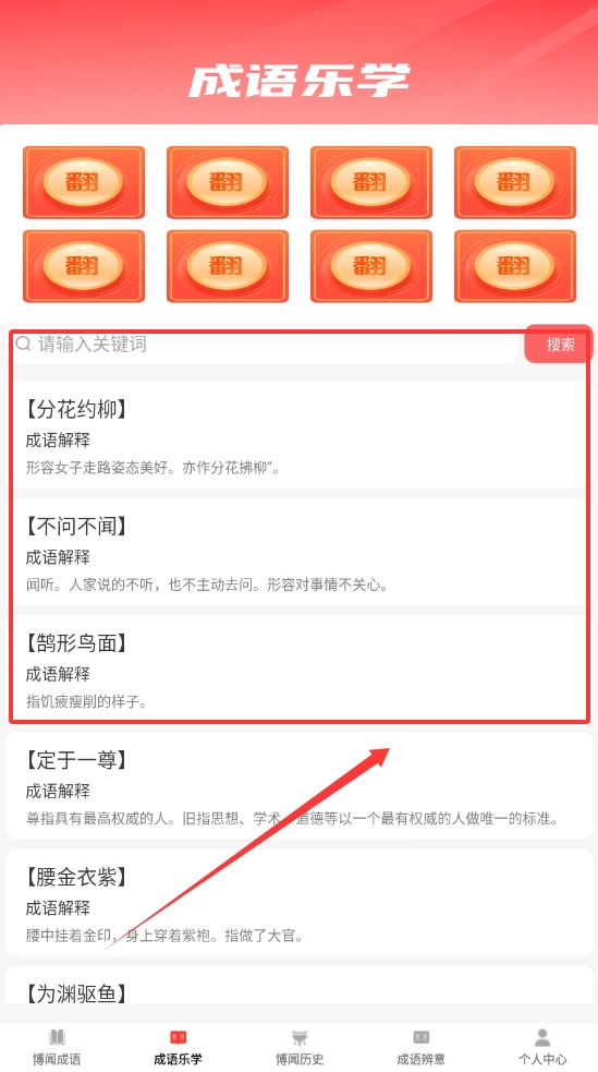 切换至“成语乐学”页面,顶部的搜索栏可快速查询成语,翻阅橙色卡片或浏览下方列表即可学习其解释。