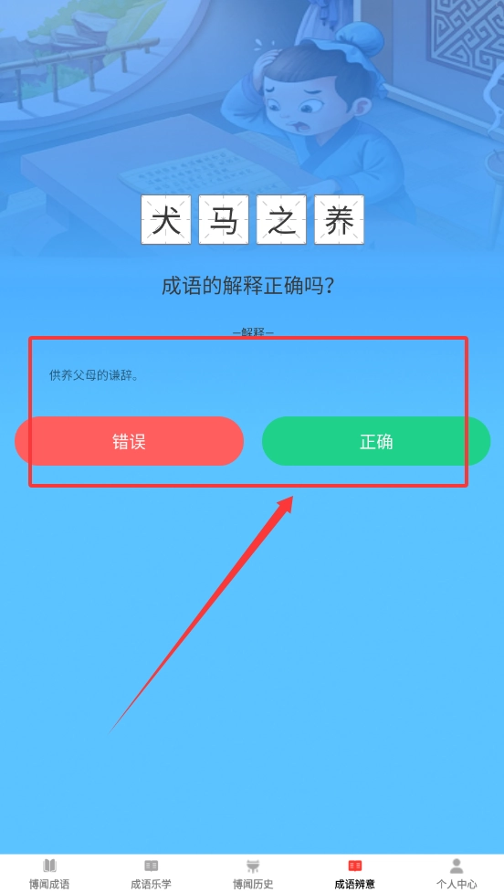 打开“成语辨意”进行判断游戏,先阅读“犬马之养”这类成语的解释,然后选择正确或错误按钮来检验自己的掌握程度。