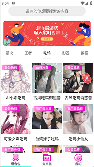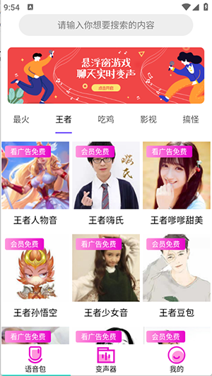 1、进入首页后,能看到众多语音包汇聚在此,涵盖最火、王者、吃鸡、搞怪等多种类型。
