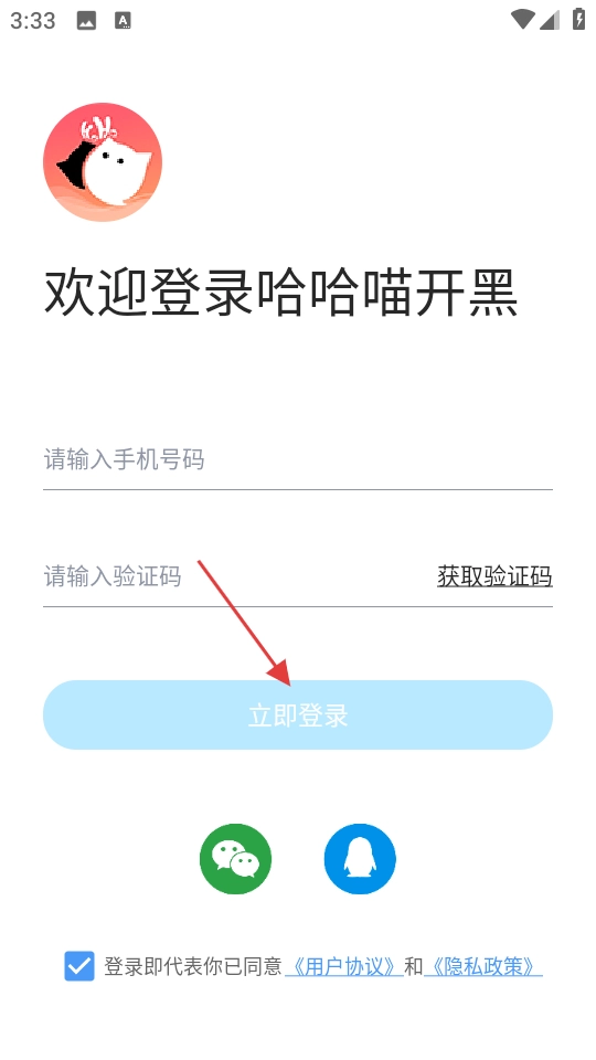 在登录页面,填写手机号与验证码,勾选相关协议后点击【立即登录】按钮,即可完成登录操作。